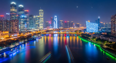 A dazzling long-exposure night photograph of the modern Tianjin skyline over the Hai River in China. The futuristic skyscrapers and bridges are brilliantly lit with a rainbow of colors, creating stunning reflections on the water, while light trails from boats add to the dynamic urban scene.