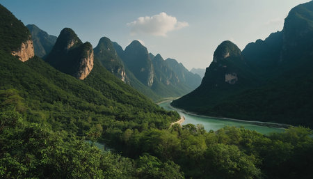 A wide view of a lush green valley with dramatic karst mountains on either side. A winding turquoise river flows through the center of the valley, bordered by dense green trees and foliage. The sky is a clear blue with a single white cloud. Sunlight casts shadows on the mountains, highlighting their rugged textures and steep cliffs.