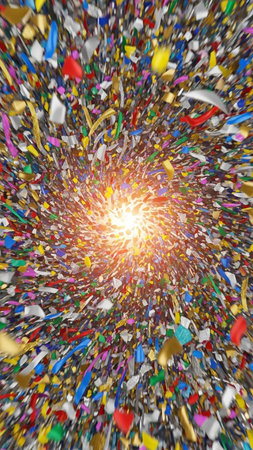 Energy showing explosion of colorful confetti and streamers swirling around a bright central light source creating a dynamic celebratory vortex effect with a sense...