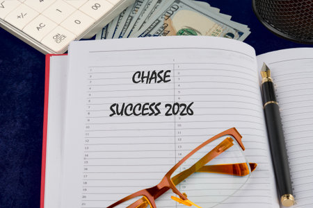 A detailed planner lays open on a blue surface showing the words chase success and the year 2026. Nearby, there are bills and a stylish pen, signaling financial planning and goal setting.
