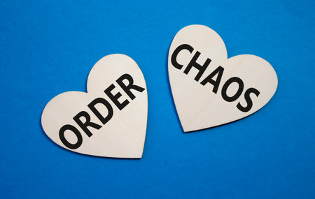 Chaos or Order symbol. Concept word Chaos or Order on wooden hearts. Beautiful blue background. Business and Chaos or Order concept. Copy space