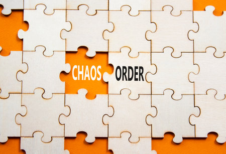 Chaos or Order symbol. Concept word Chaos or Order on wooden puzzle. Beautiful orange background. Business and Chaos or Order concept. Copy space