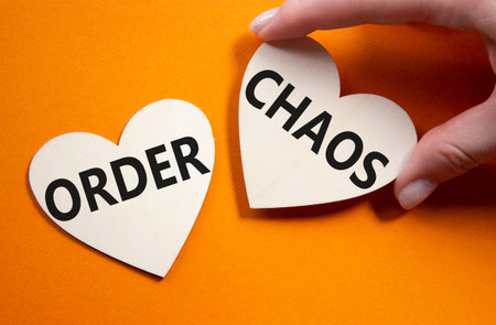 Chaos or Order symbol. Concept word Chaos or Order on wooden hearts. Businessman hand. Beautiful orange background. Business and Chaos or Order concept. Copy space