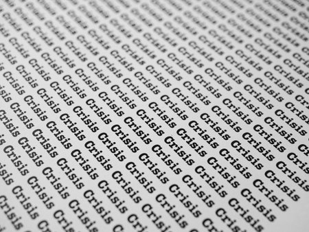 Crisis, word in wooden alphabet letters isolated on purple and yellow background