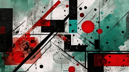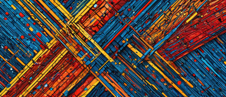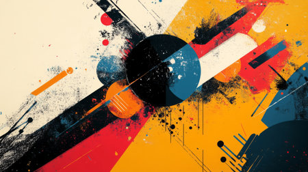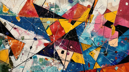 This vibrant abstract artwork features a dynamic composition of geometric shapes lines and patterns in a bold modernist style The layers of textures colors and juxtaposed elements create a visually