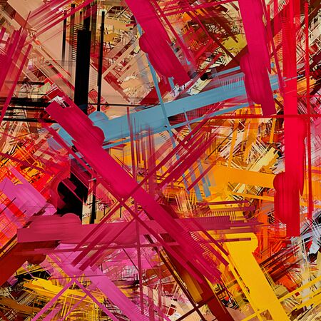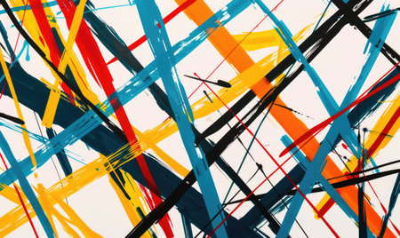A dynamic canvas featuring bold, overlapping lines and energetic paint drips in a spectrum of colors.