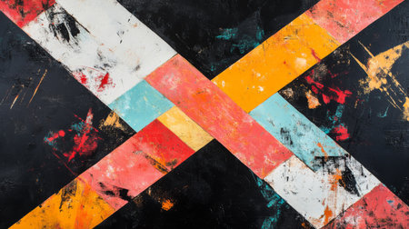 This vibrant abstract artwork features a colorful geometric pattern on a textured dark background, showcasing splashes and brush strokes that evoke modern aesthetics.