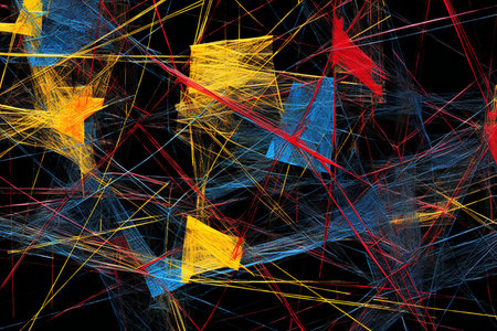 This piece showcases a striking use of color and movement, embodying a modern abstract style that energizes any visual project. Ideal for use in digital media, graphic design, or as an artistic element in presentations and websites. Its sharp lighting and bold lines make it a versatile asset for creative professionals seeking to add a dynamic flair to their work. AI-generated illustration.