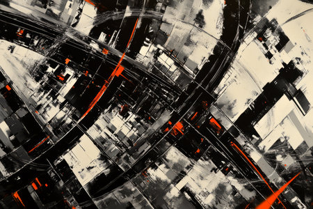 the monochrome abstract art, inspired by sia's eclectic style and the importance of sustainability, delves into the political science of computer technology, featuring a unique blend of geometrical and vintage elements, created with a rough ink brush that adds a touch of creative randomness to the overall piece. ai generated