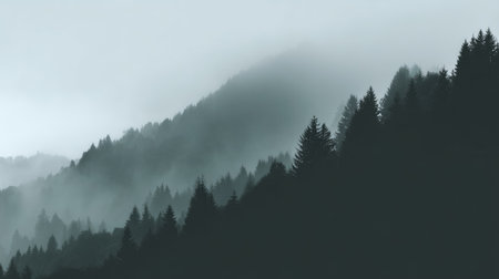 Forested mountain slope in low lying cloud with the evergreen conifers shrouded in mist in a scenic landscape view