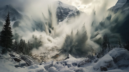 Huge snow avalanche, a mass of snow, ice, and rocks falling rapidly down a mountainside, nature concept