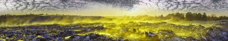 beautiful foggy dawn of the Sun over a huge field of urban garbage, saturated with poisonous fumes of decomposition of organic waste and household chemicals