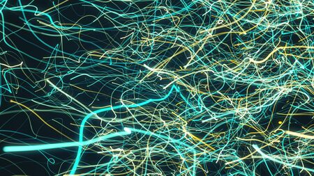 Many chaotic color neon flowing strings. Computer generated abstract background, 3d render