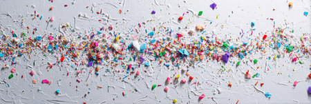 Bright pieces of confetti in various colors and shapes cover a textured white surface, creating a playful and vibrant atmosphere for a celebration.