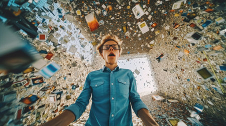 A person wearing sunglasses is surrounded by colorful confetti expressing joy during a celebratory event at a fun gathering.