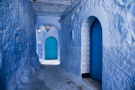 Typical moroccan narrow street in Chefchaouen. Blue city medina in Morocco with blue painted walls.