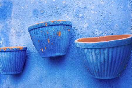 empty three flowerpot are located separately on the plastered wall closeup for vintage interior