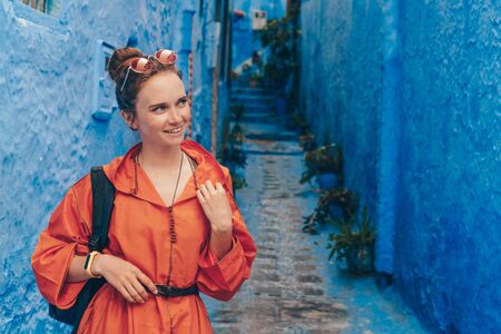 Young woman in red dress in the blue city, Happy tourist walking in Moroccan city street, Travel and vacation lifestyle.