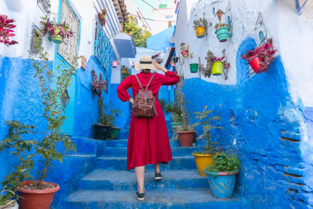 Colorful journey from Morocco. young tourist in red dress walking in the medina of the blue city Chefchaouen.