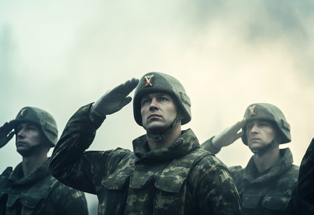 group of military soldiers saluting behind one another. the defense of the country and its defenders, by ai generative