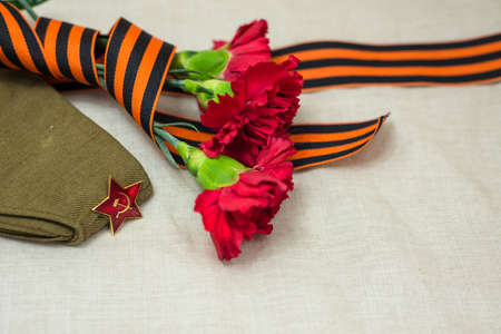 Military cap with red flowers, Saint George ribbon and orders of Great Patriotic war on white background. illustrative editorial.