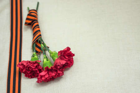 Postcard may 9 - red carnations Ribbon George Old photos on a wooden background. Symbol of victory in the great Patriotic war.