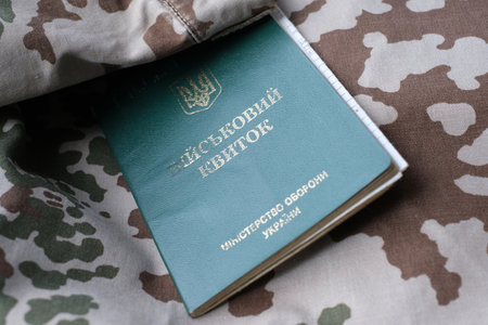 Ukrainian military ID on the military uniform. The concept of mobilization, description. War in Ukraine. stop war