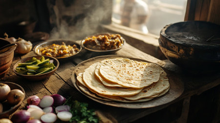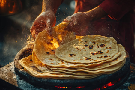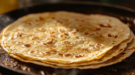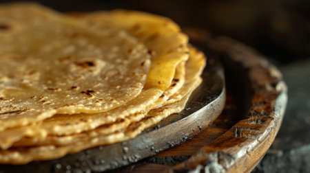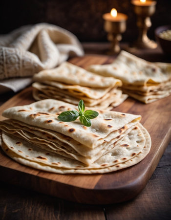 This image depicts a stack of freshly cooked flatbreads resting on a wooden surface, with steam gently rising, highlighting the essence of traditional culinary skills and inviting warmth.