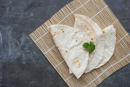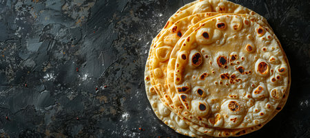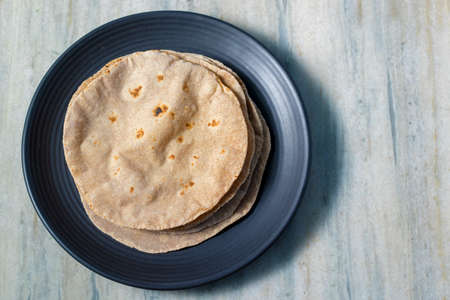 Traditional Kerala Indian cuisine. Homemade flatbread chapati on gray slate background. Copyspace, top view, flatlay. Color surge trend.
