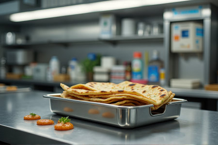 Freshly baked flatbreads in a commercial kitchen setting. That the image is generated using AI.