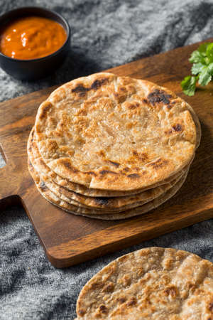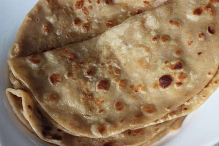 Closeup view of hand made plain bread in oil called paratha roti. Paratha is popular in India, Pakistan and other South Asian countries. Texture for bread.