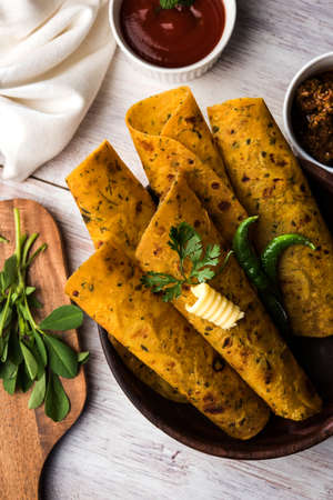 Methi Paratha (Thepla) / Indian flat bread using fenugreek leaves, selective focus