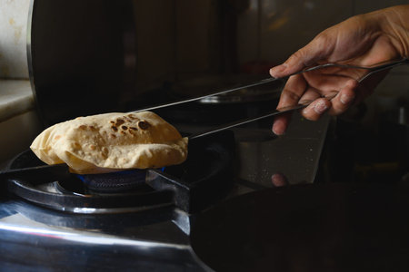 Indian chapatti on fire, Pushkar, India. Close up. Bread cake is fried on an open fire on a gas stove. Indian street food in the evening.