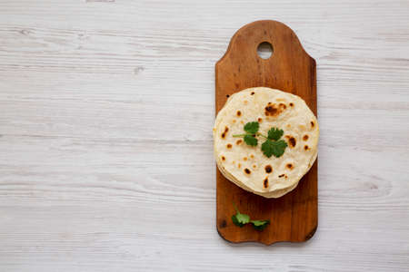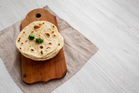 Homemade Roti Chapati Flatbread on a rustic wooden board on a white wooden background, side view. Space for text.