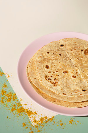 Homemade hot chapati on kitchen countertop background. Slide from left.