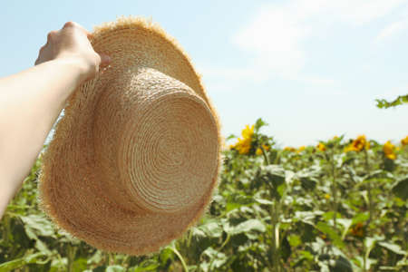 Woman hand hold straw hat in sunflower field. Agricultureure