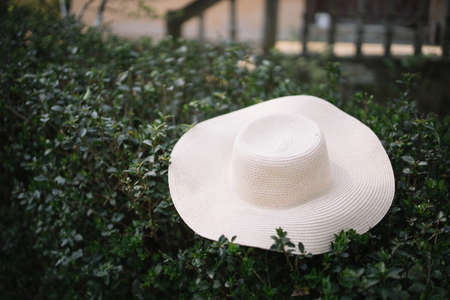 Beige female sun hat on green bush. Close-up photo of women's hat on plant in the garden .