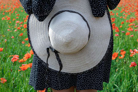 Close-up of female hands holding summer hat the background of field with poppies. Vacation concept
