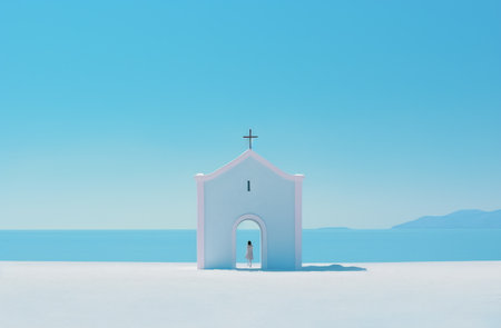 Minimalist white chapel with a vivid blue door set against a serene sea and clear sky, embodying tranquility and spirituality.