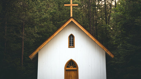 A charming white wooden chapel with a cross stands serenely among lush trees. The peaceful atmosphere invites reflection and a sense of tranquility in nature.