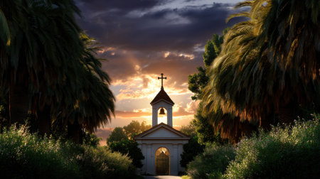 A picturesque scene featuring a charming chapel at sunset, framed by towering palm trees. The dramatic sky and lush greenery create a serene atmosphere.