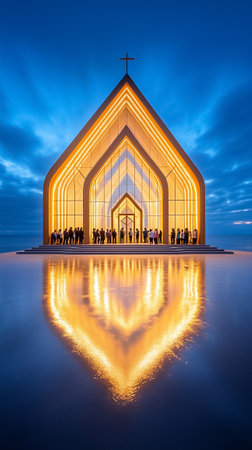 Visitors admire a beautifully illuminated glass church at dusk, with stunning reflections on the water nearby.