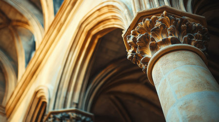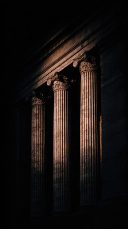 The image showcases a series of classical architectural pillars with elaborate carved capitals. The composition features soft, diffused lighting, creating subtle shadows and highlights on the stone surfaces. The scene evokes a sense of historical grandeur. Suitable for visual storytelling, it can be used for various commercial or editorial purposes.