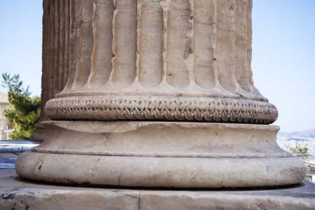 Corinth pillars architecture building front side marble material ancient object close up view from below