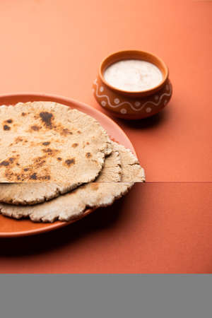 Soft flat bread made of pearl millet flour. Served with chicken in cashew gravy garnished with fresh coriander leaves. Shot on white background. Commonly called bajra roti and chicken curry in India