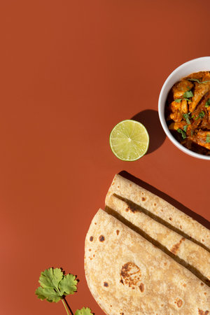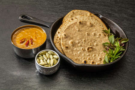 Traditional Kerala Indian cuisine. Homemade flatbread chapati on gray slate background. Copyspace, top view, flatlay. Color surge trend.