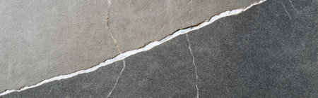 Close-up of leathered soapstone slab with rough surface texture, natural crack pattern and contrast between gray and dark stone layers.