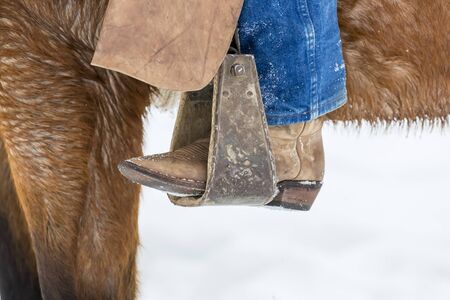Cowboy leather boots and a pair of jeans in the stable of the ranch