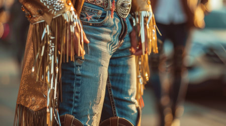 This close-up showcases the intricate details of distressed denim paired with leather accessories adorned with studs, perfect for fashion enthusiasts.