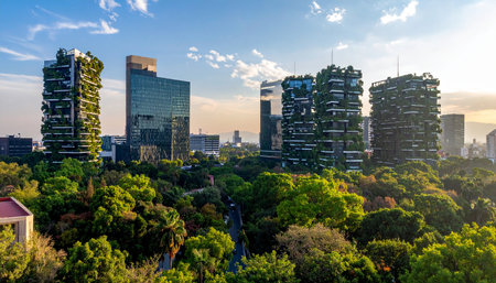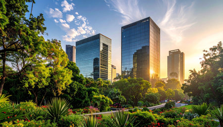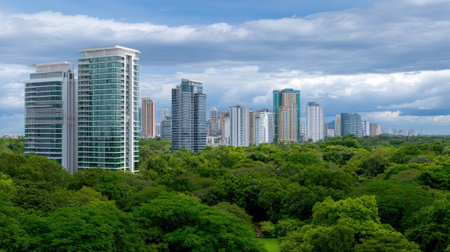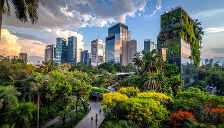 This stunning image captures a vibrant urban landscape where modern skyscrapers rise amidst lush greenery, inviting viewers to enjoy the harmonious coexistence of nature and city life.